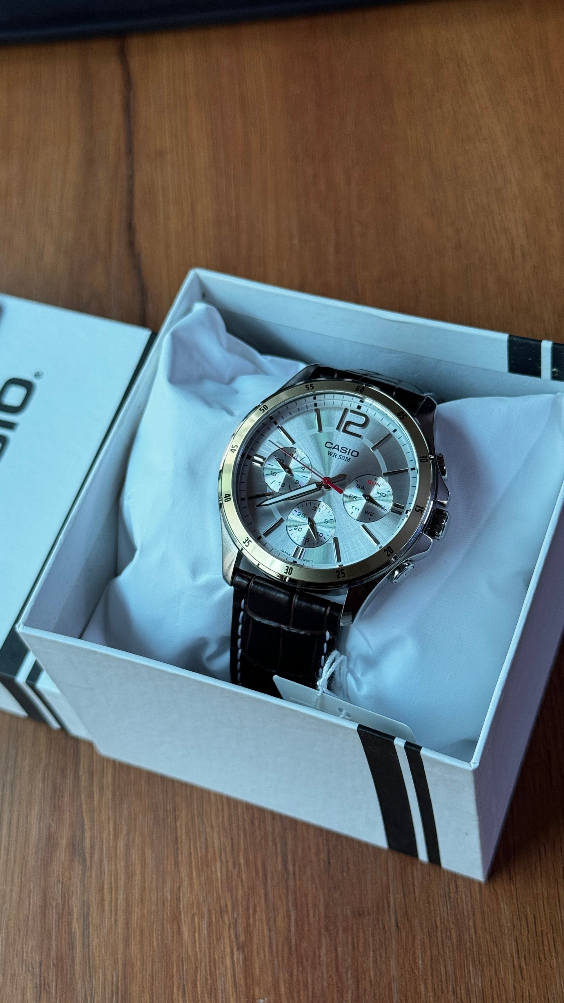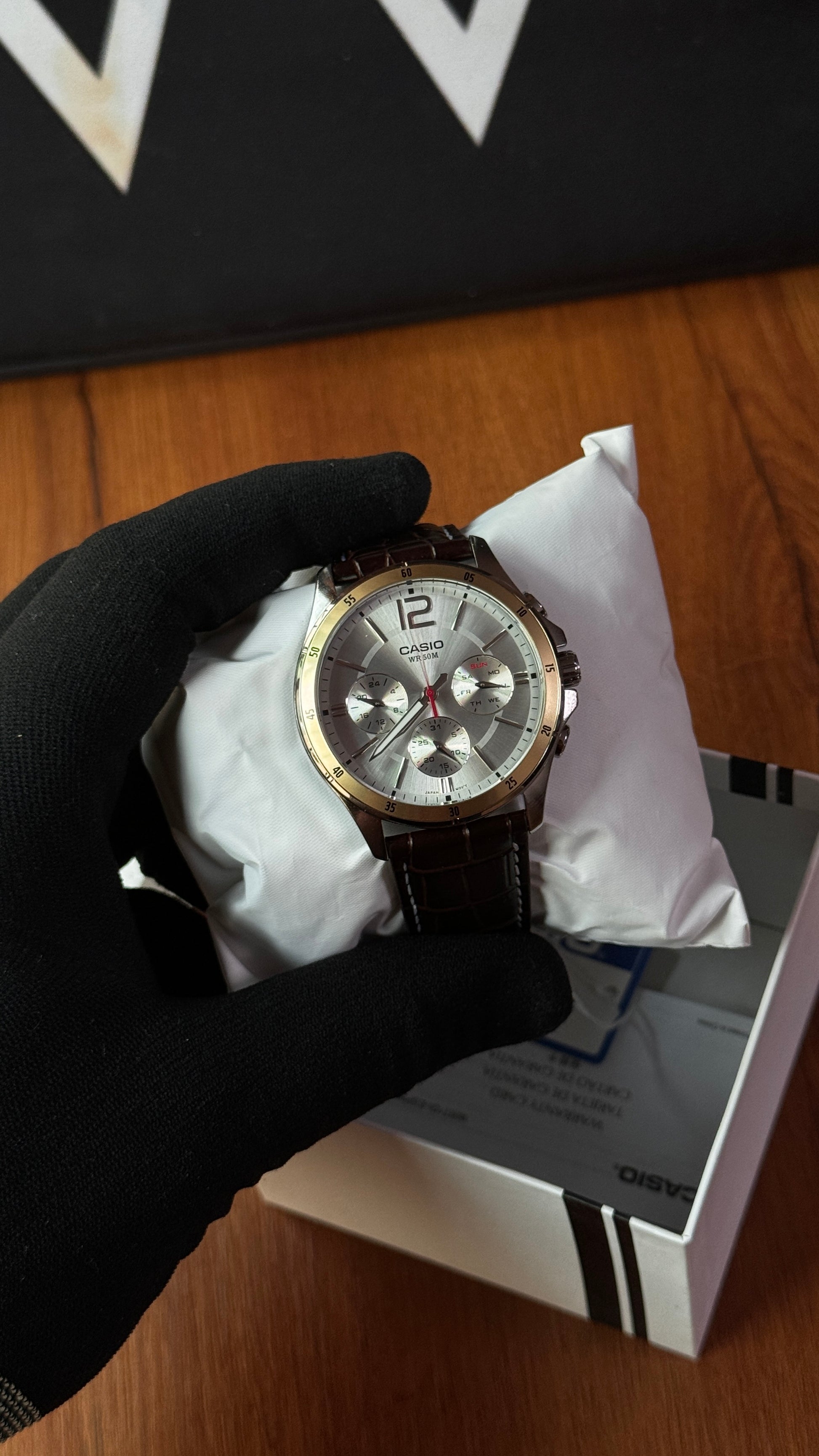 A stunning casio chronograph that offers plenty of versatility. A beautiful brown leather strap compliments the watch. Brand new with complete box.