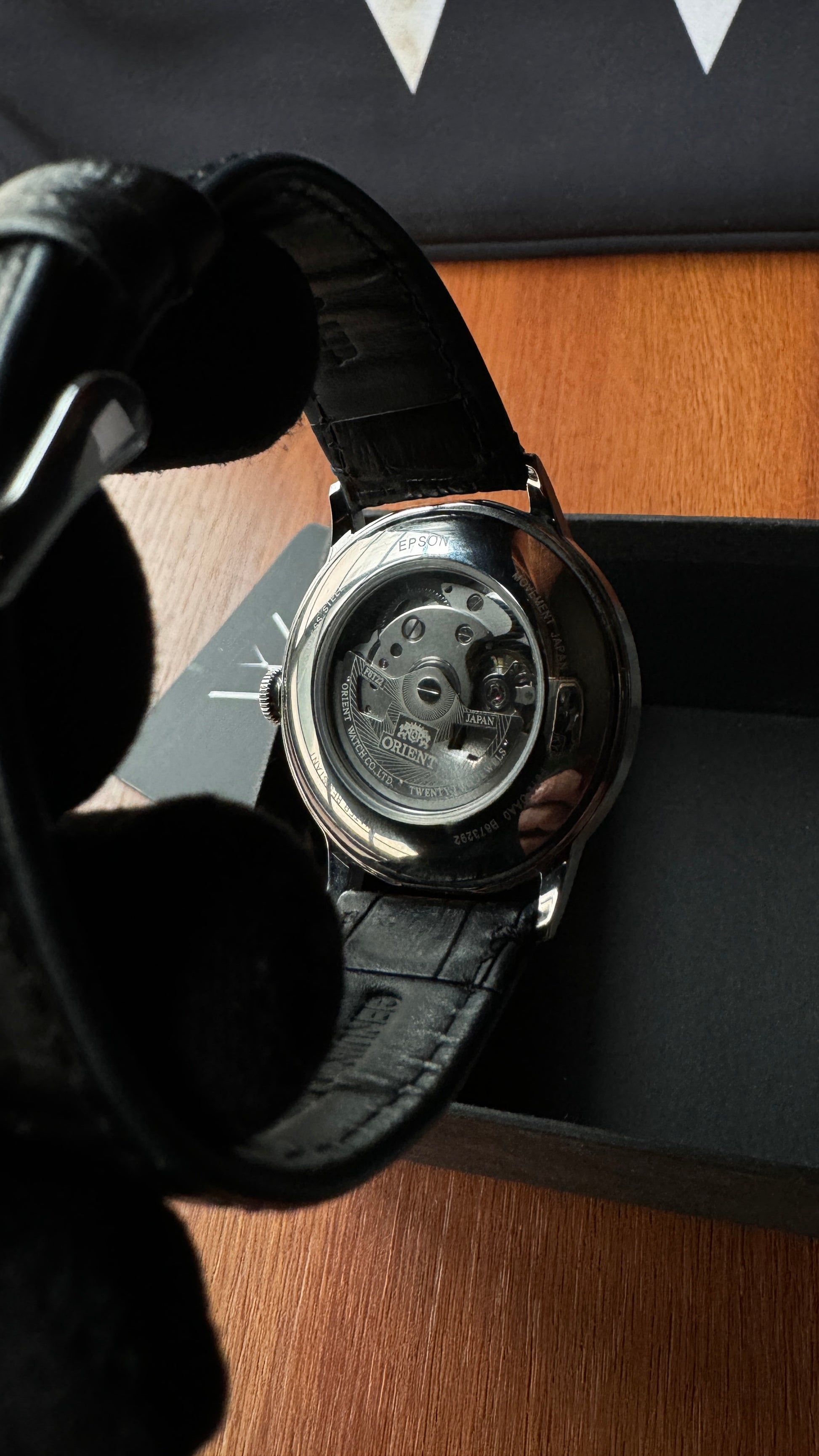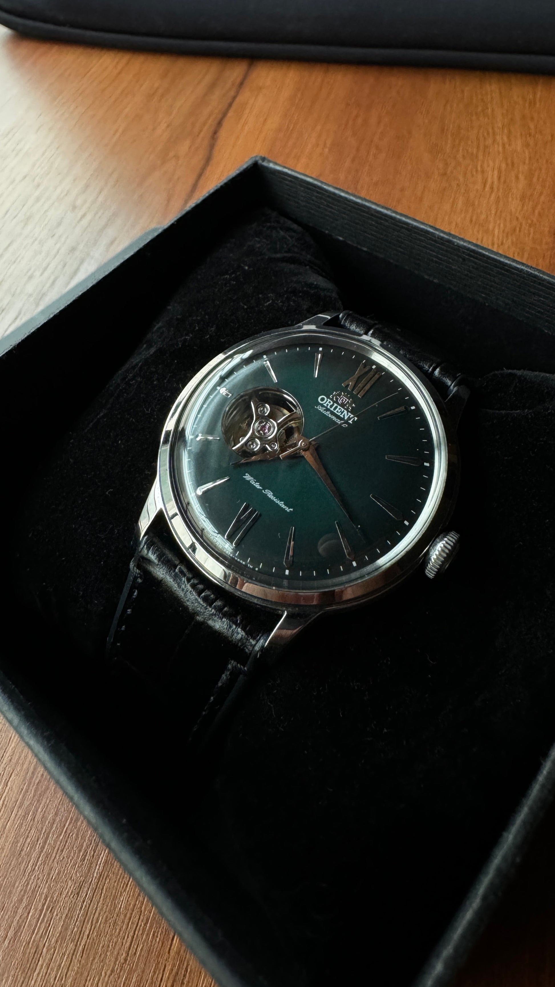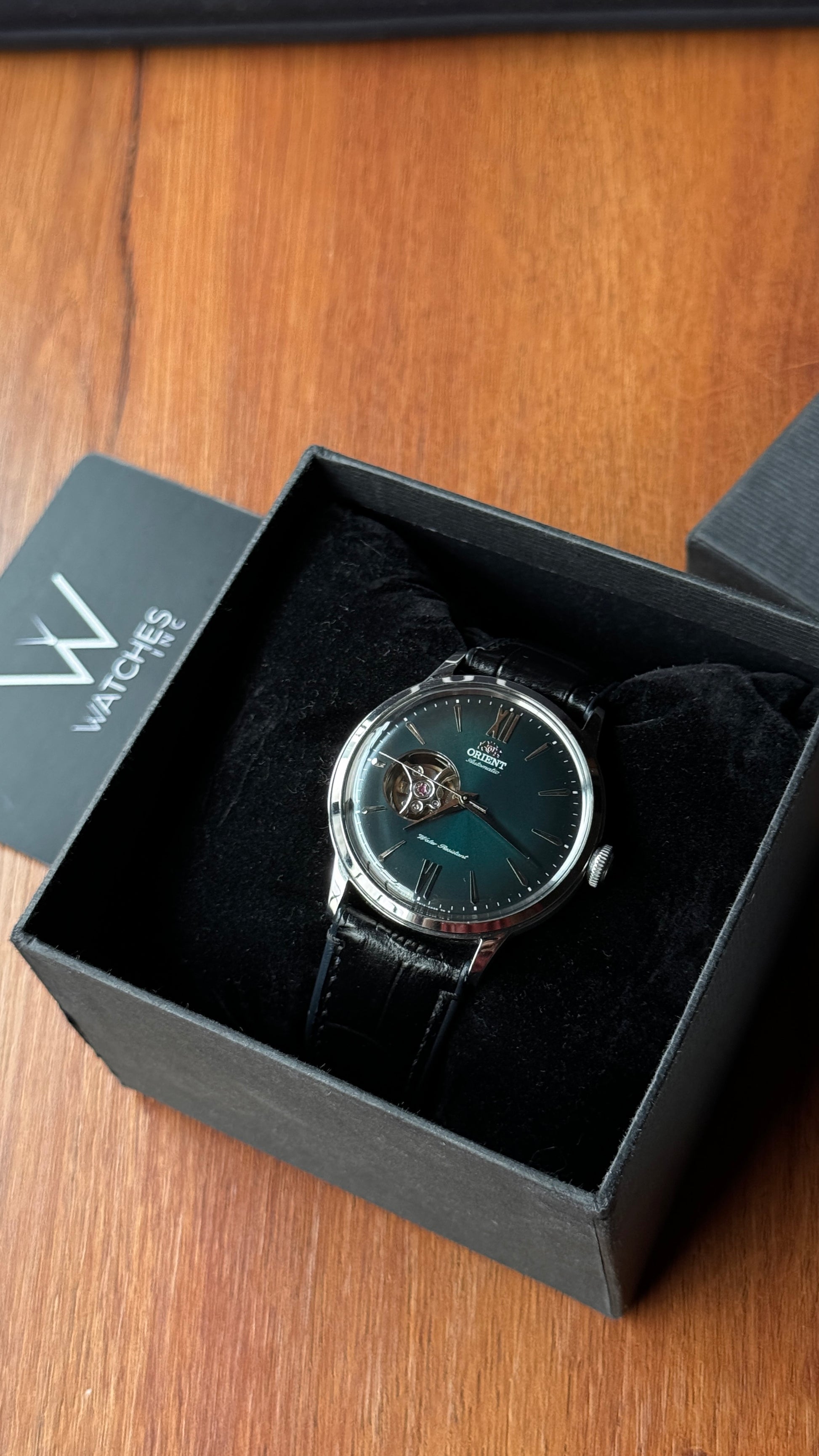This Orient Green Helios is a classic timepiece that seamlessly combines vintage elegance with modern craftsmanship. This exquisite watch features a sleek and polished stainless steel case, measuring at a versatile 40.5mm in diameter, ensuring a balanced and timeless aesthetic suitable for any occasion. An open heart dial with an orient strap & its original bracelet. Everything is in pristine condition.