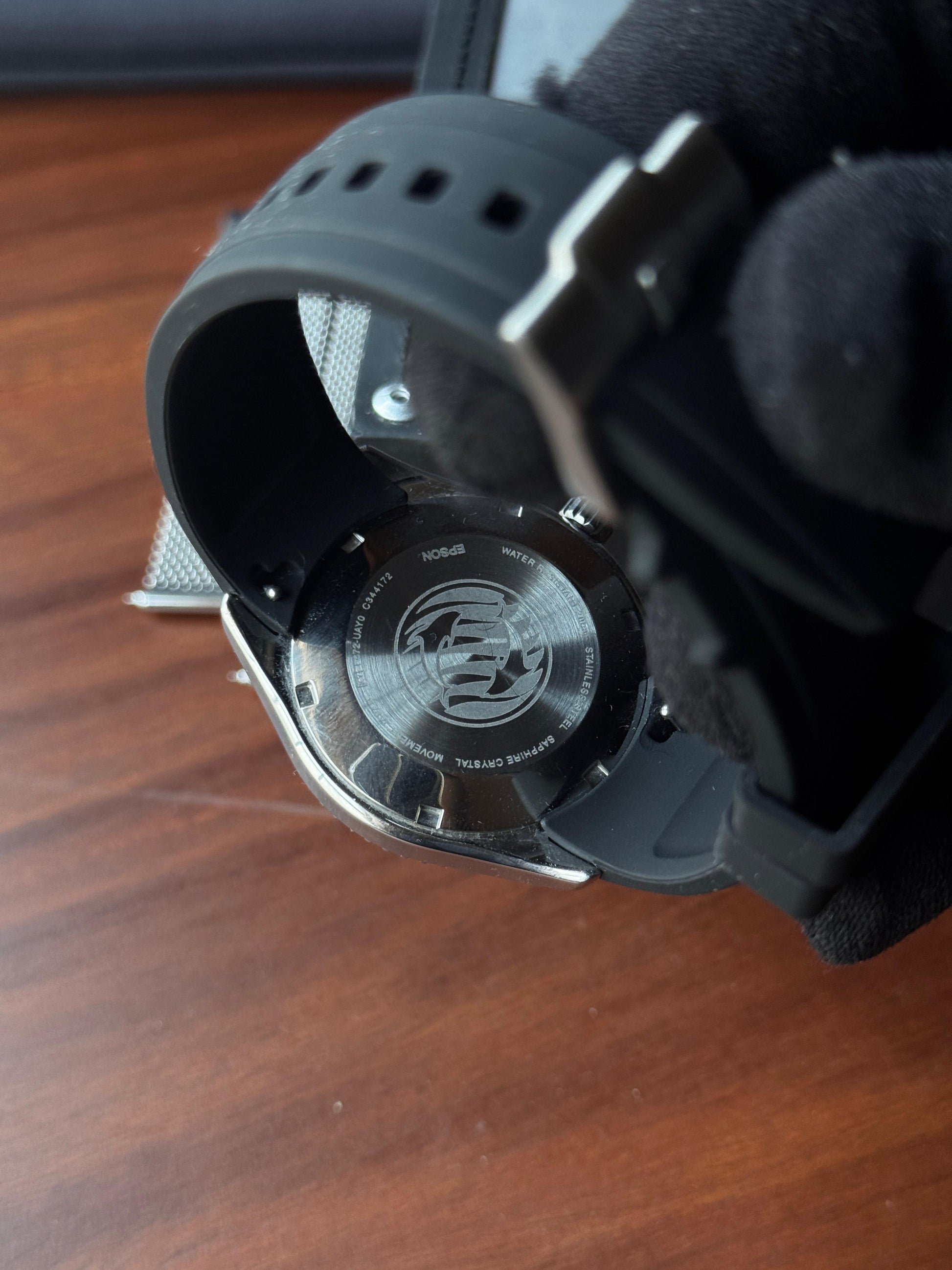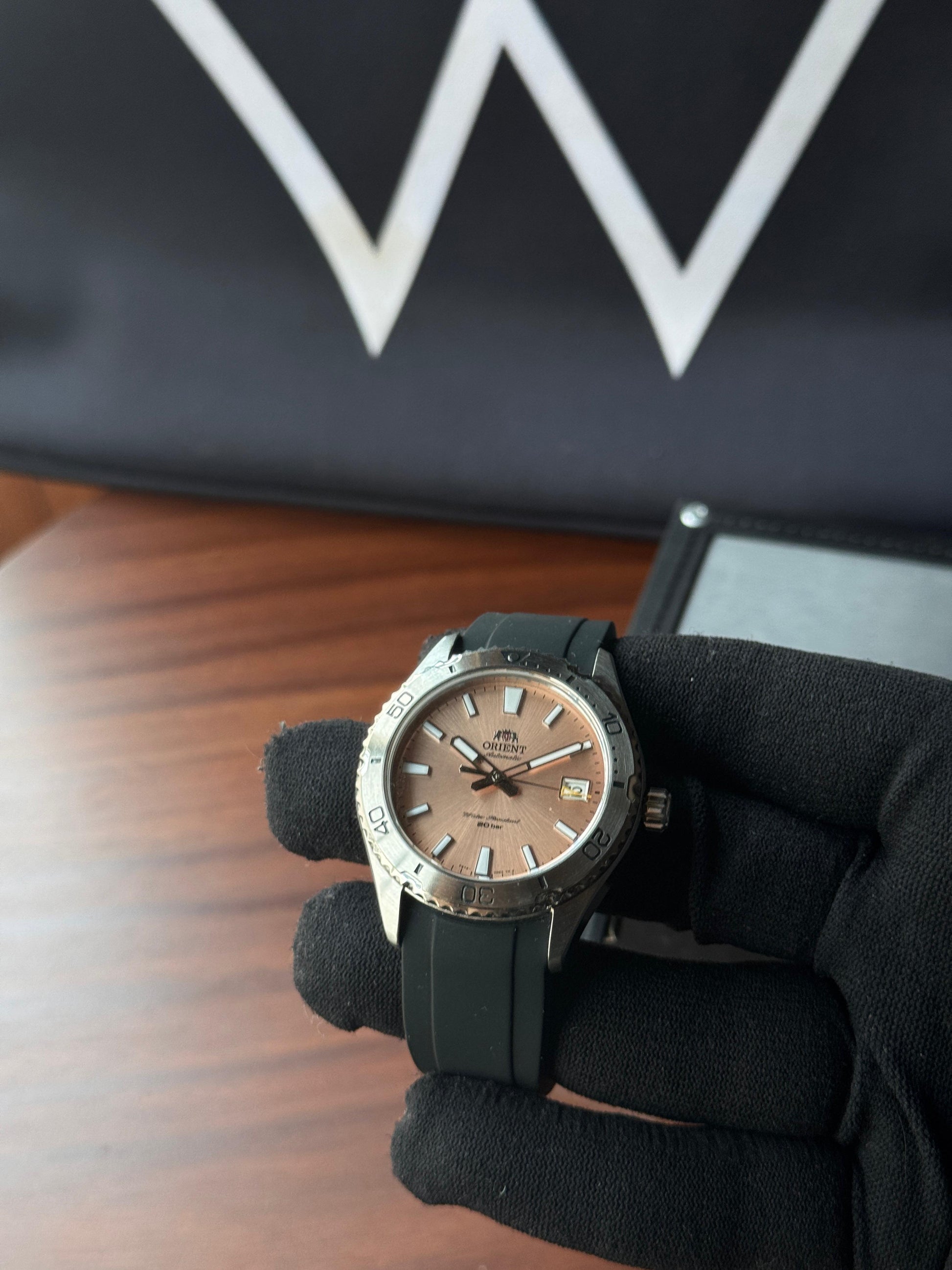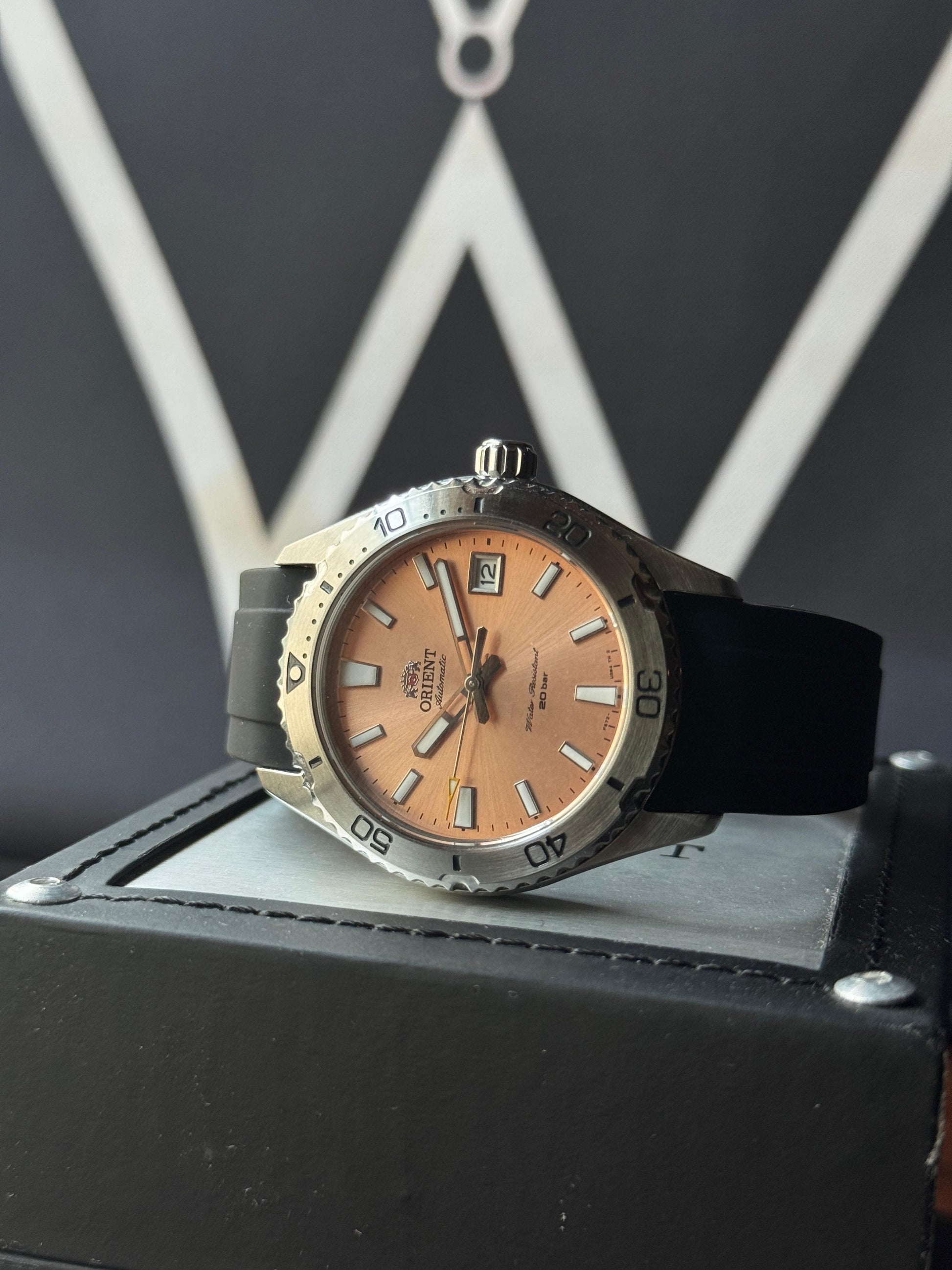 The Orient Mako Sapphire Crystal Diver RA‑AC0Q05P10B takes the spirit of a classic diver and refines it to fit more wrists without losing any toughness. With a striking apricot-orange dial and sapphire crystal, it commands attention. Powered by Orient’s in-house F6722 automatic movement, it offers a 40-hour reserve, hacking & hand-winding. Grab this exquisite timepiece in mint condition and with hi-end aftermarket rubber strap and mesh bracelet.