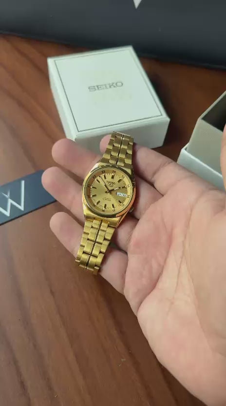 The Seiko 5 SNK574 features a rich gold-tone finish paired with a compact 36mm case, making it a great option for those who prefer a classic and comfortable fit. Powered by Seiko’s reliable automatic movement, it’s built for everyday wear with a clean and simple design. This watch is in like-new condition and comes complete with the original box.