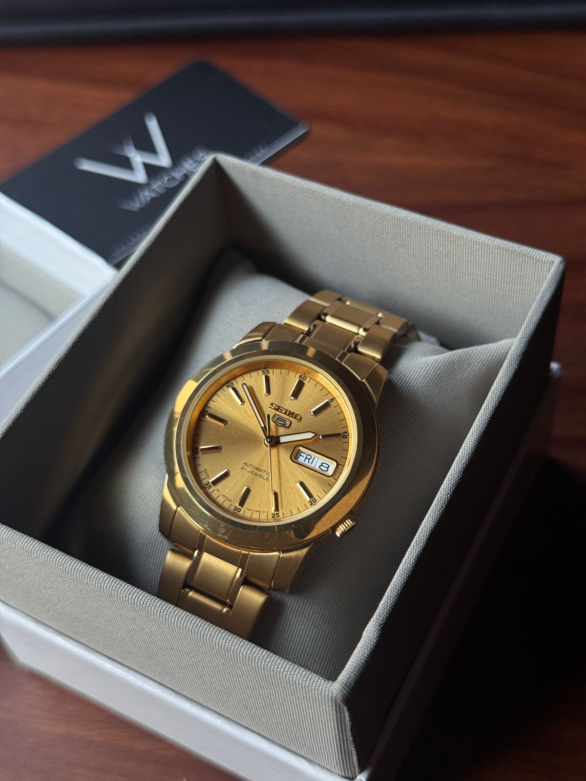 The Seiko 5 SNKE56K1 comes in a full gold-tone finish, giving it a bold and eye-catching look. Its 39mm case and automatic movement make it a dependable everyday watch. The piece is unused, with only light handling marks that are barely noticeable. It comes with the complete box, making it a great option for someone looking for a standout Seiko 5 in fresh condition.