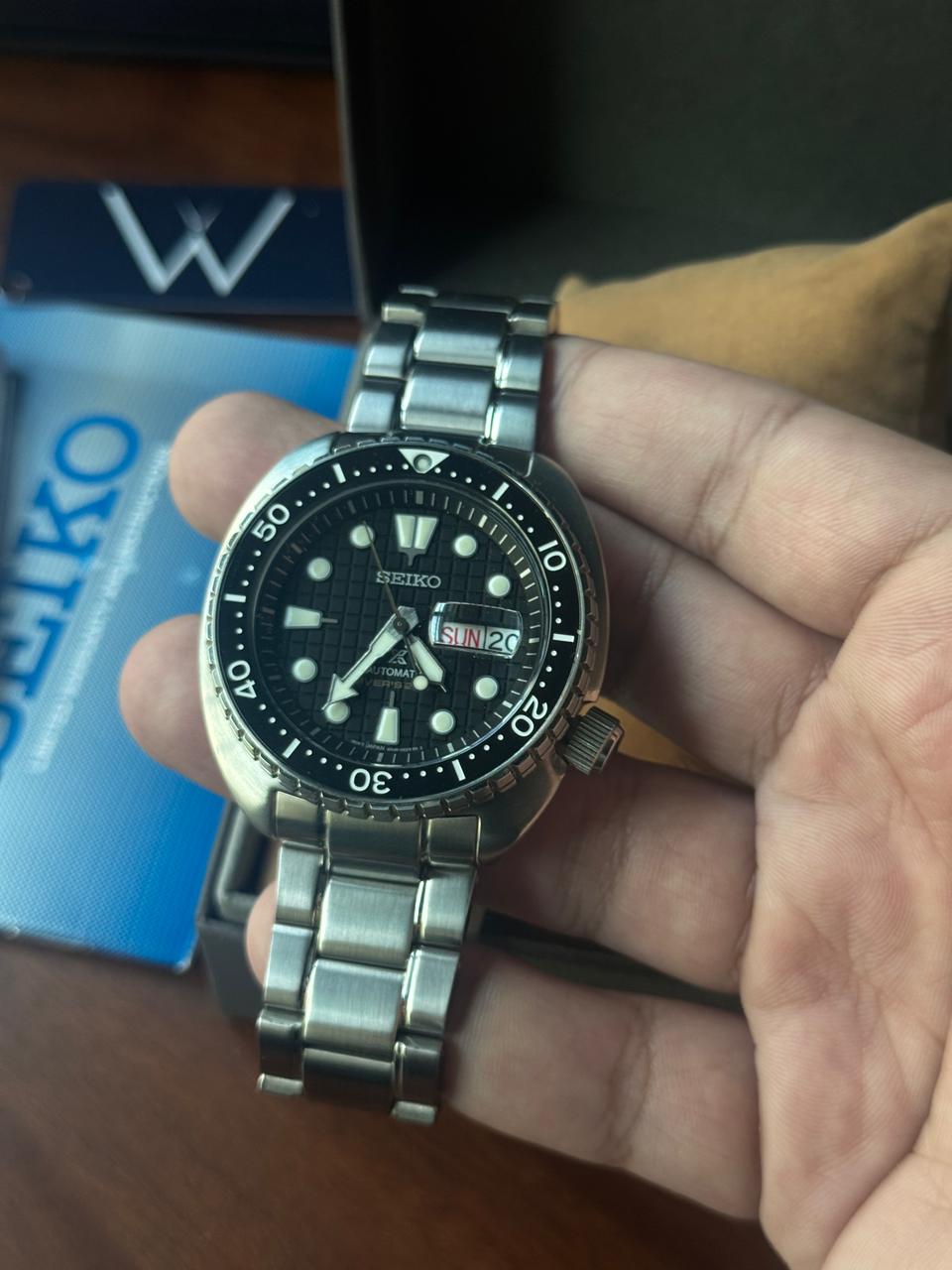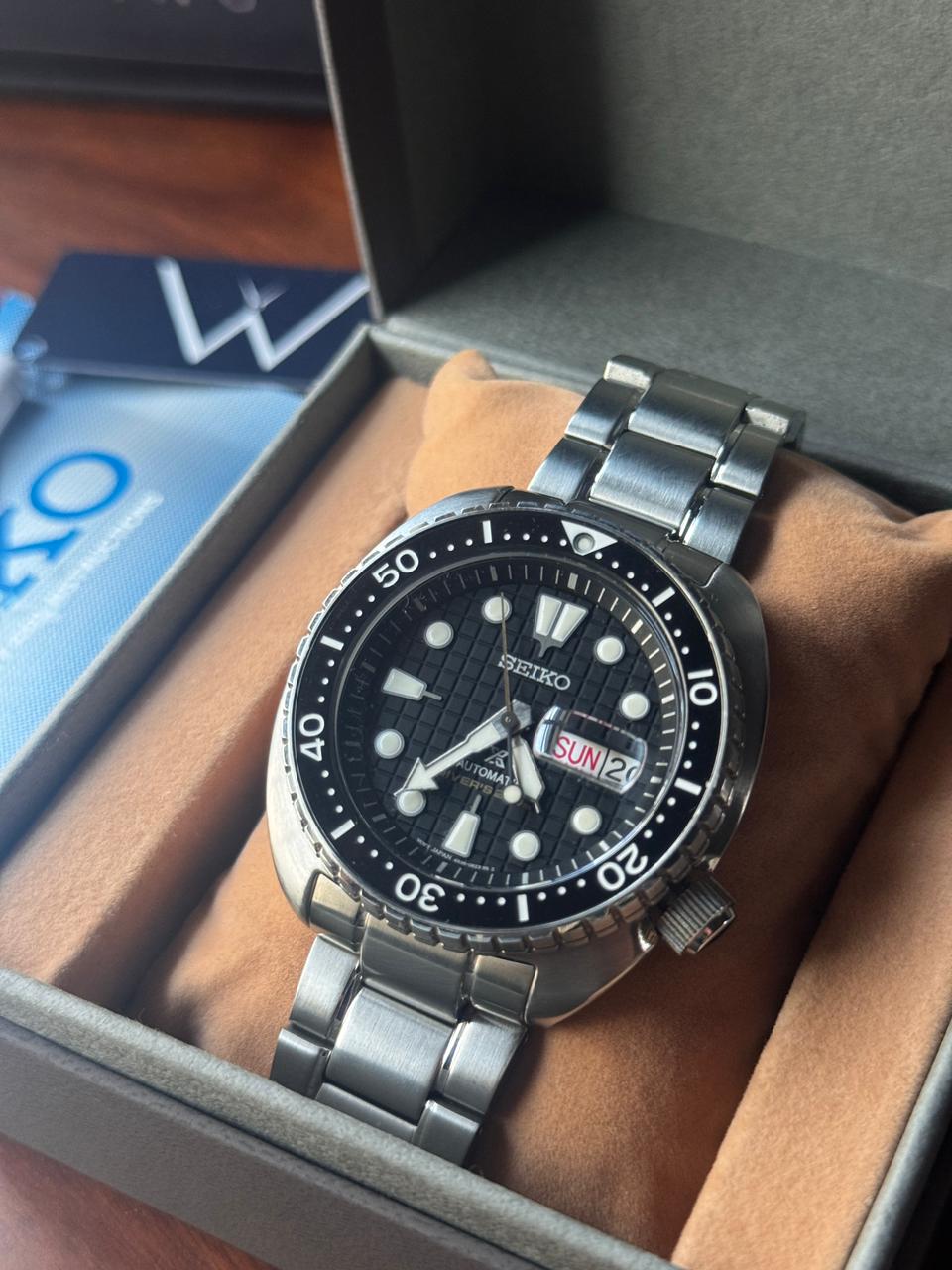The Seiko King Turtle SRPE03 is a legendary diver’s watch known for its rugged build and iconic cushion case design. Featuring a sapphire crystal and ceramic bezel, it offers enhanced durability and a premium feel over the standard Turtle models.