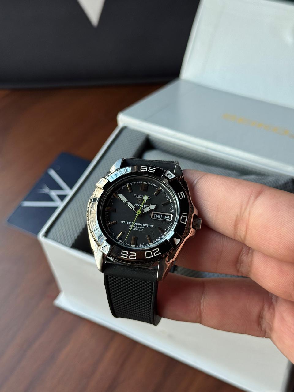 The Seiko SNZB23J1 Sports Diver is a tough and reliable 40mm automatic watch built for daily wear. It is in excellent condition and comes fitted with a high-end imported rubber strap for comfort, while the original bracelet is unused and included. This watch is a great choice for someone looking for a solid Seiko diver with both versatility and value.