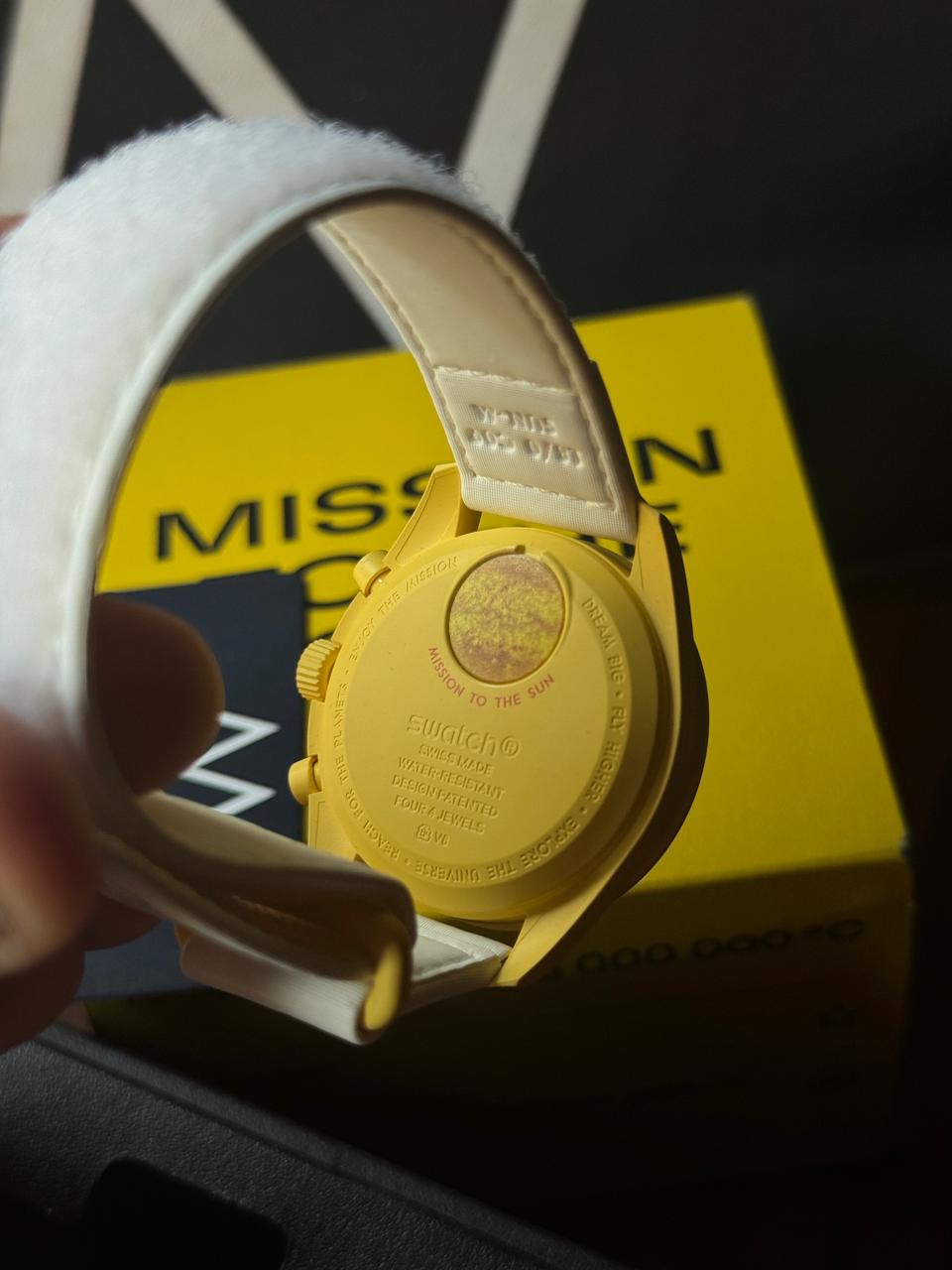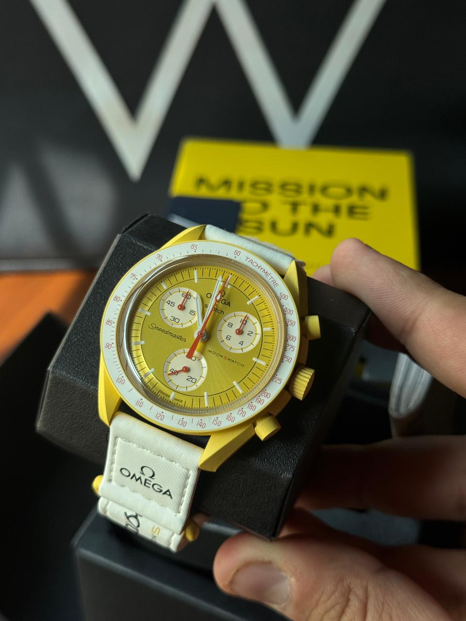 The Swatch x Omega MoonSwatch “Mission to the Sun” is a bold 42mm quartz chronograph inspired by the iconic Omega Speedmaster design. Featuring a bright sun-inspired colorway and lightweight Bioceramic case, it delivers a sporty and modern look while staying comfortable on the wrist. This watch is brand new and comes complete with its original box.